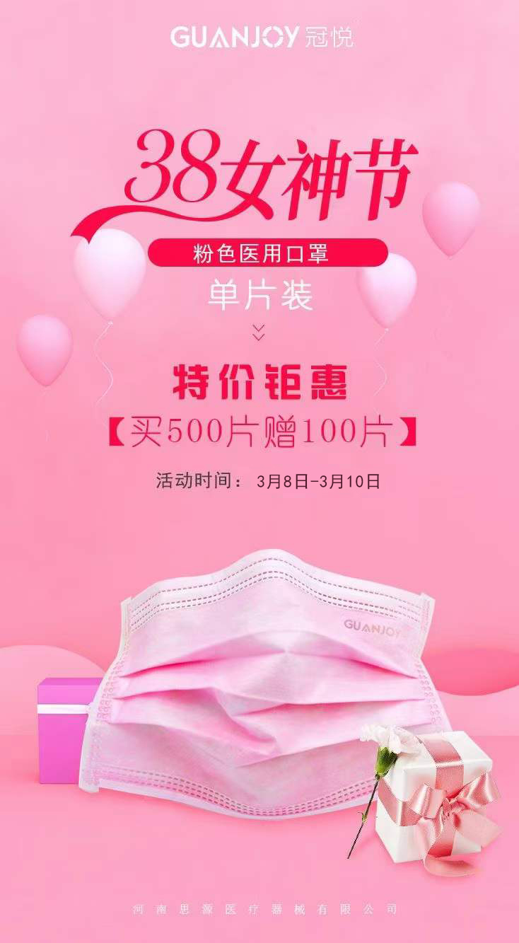 冠悅一次性醫用口罩,粉色獨立包裝,三層防護,守護女神健康。冠悅粉色醫用獨立包裝口罩3.8活動來襲,買500片送100片,活動時間:3.8-3.10,聯系方式:13526647565!