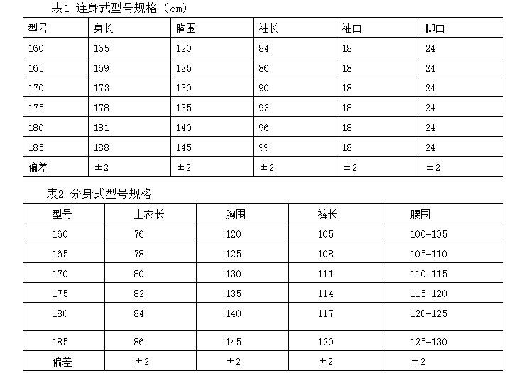 防護服號型分為160、165、170、175、180、185,型號規格見表1 和表2 。