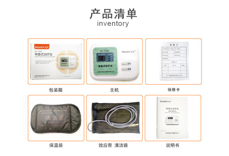 熱墊式治療儀由主機和治療帶(包括效應帶、清潔袋和保溫帶)組成。治療帶 保溫帶 清潔袋 注:效應帶縫制在清潔袋中