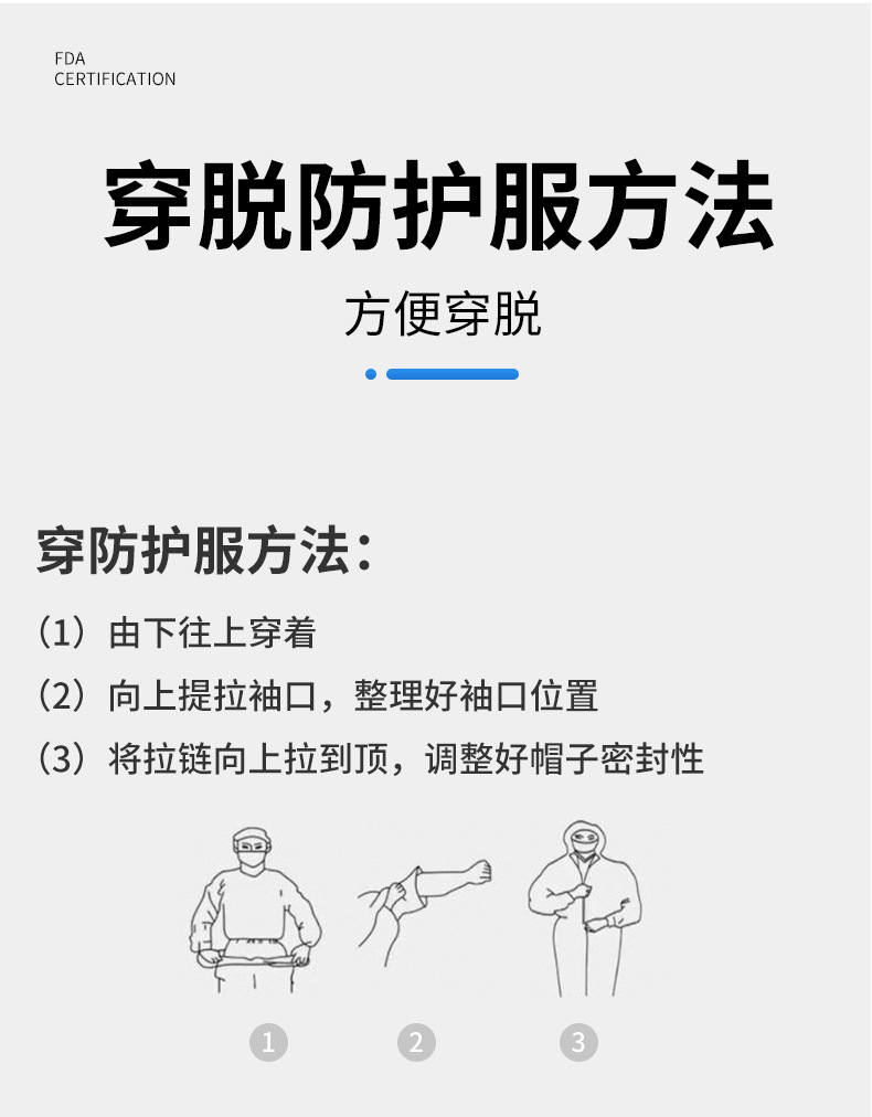 醫(yī)用防護服是有有效期的,放置時間過長可能使防護性能下降。市場上絕大多數(shù)醫(yī)用防護服均為非織造布制成的一次性防護服,使用后即廢棄,無需消毒、洗滌。穿戴防護服前應檢查是否有破損,使用后按照醫(yī)療廢物處理。