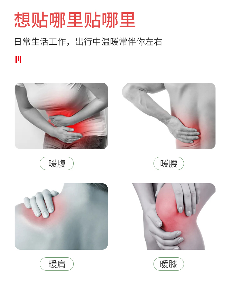 冬天寒冷低溫又到了貼暖寶寶的時候了,貼暖寶寶對腰,肩,胃,腿及關節等疼痛均有緩解作用,所以特別適合老年人。在寒冷的冬季外出防止凍傷驅寒有很好的效果,攜帶方便,發熱持久穩定,每天只要貼上薄薄的一片就能抵御您一天的寒冷。