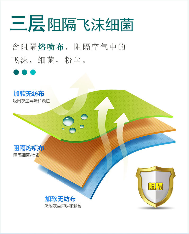 3、中間M層用的是經(jīng)過駐極處理的熔噴布,能過濾細(xì)菌懸浮顆粒,是最重要的核心層。